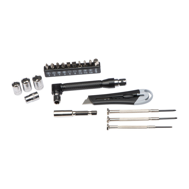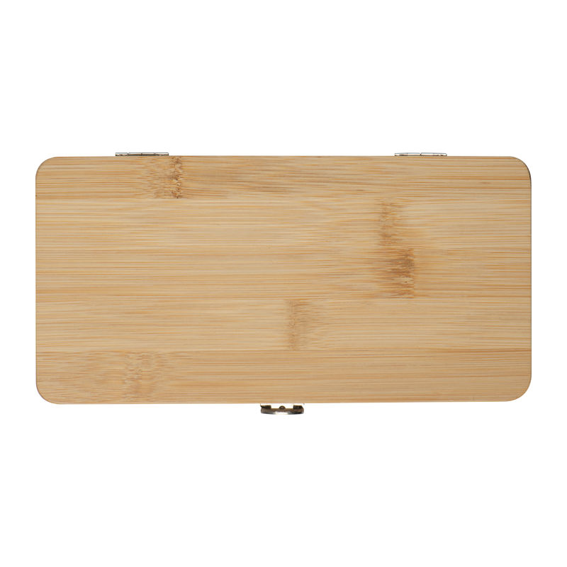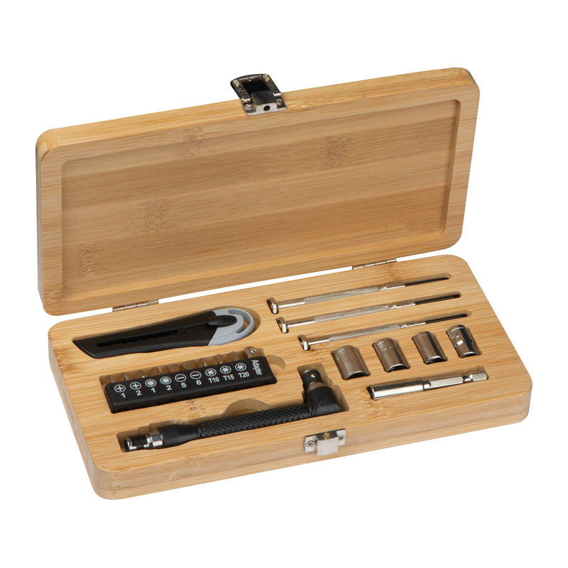 21 darabos szerszámkészlet bambusz tokban, amely 3 csavarhúzót, különféle adapteres biteket, valamint vágót és 4 hatszögletű kulcsot tartalmaz.