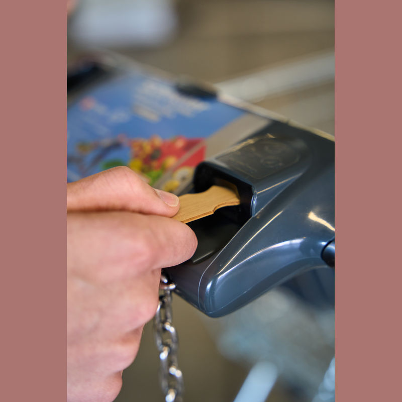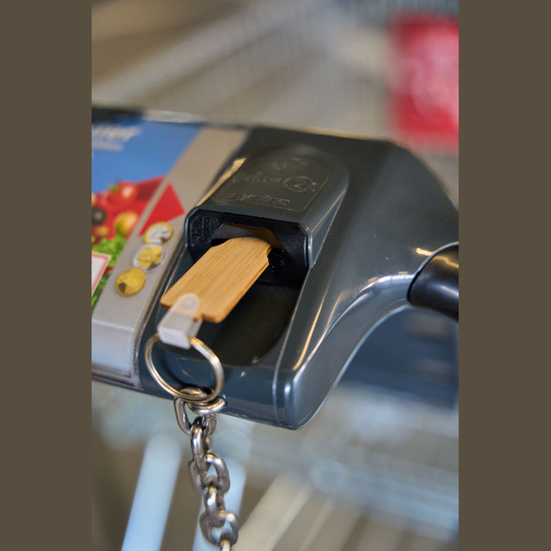 Bevásárlókocsi-érme és kulcstartó, mely bambuszból készült.