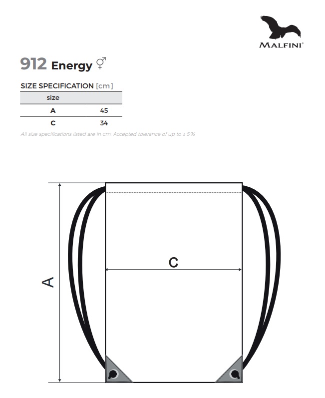 A Malfini Energy 912 tornazsák ideális választás mindennapi használatra, sportoláshoz vagy rendezvényekhez, amikor fontos a könnyű hordozhatóság és a praktikum. Strapabíró, mégis pehelykönnyű poliészter anyagból készült, amely kényelmes viseletet és hosszú élettartamot biztosít. Húzózsinóros záródása egyszerű és gyors hozzáférést tesz lehetővé, így tökéletes választás edzőcucc, váltóruha vagy kisebb felszerelések szállításához.