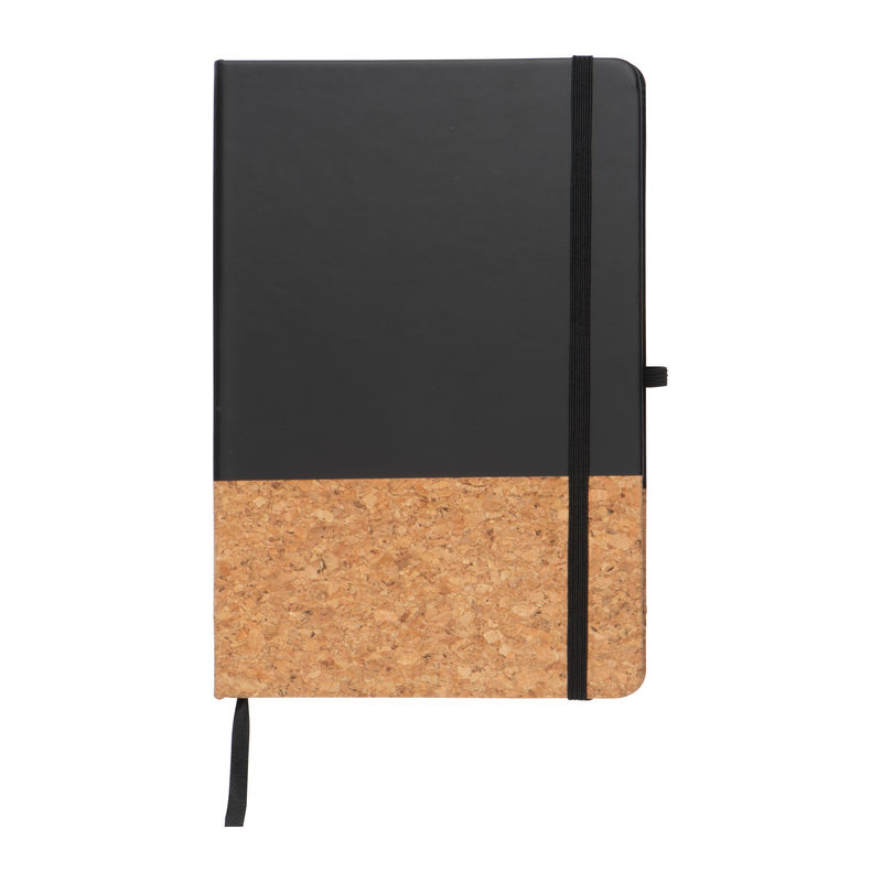A5 méretű jegyzettömb, 160 vonalas oldallal, PU és parafa borítással, könyvjelzővel, tolltartó hurokkal és rugalmas zárópánttal.