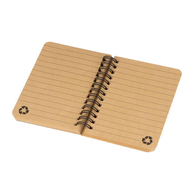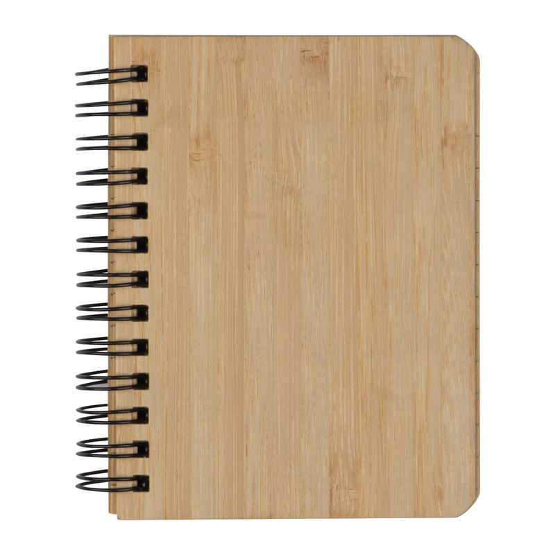 Kisméretű spirálkötésű jegyzetfüzet, bambusz borítóval és 160 vonalas oldallal, újrahasznosított papírból.